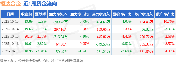 资金流向数据方面,本周福达合金主力资金合计净流出1215.07万元,游资资金合计净流出699.97万元,散户资金合计净流入1915.03万元。本周资金流向一览见下表: