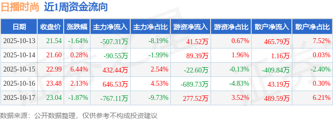 资金流向数据方面,本周日播时尚主力资金合计净流出286.01万元,游资资金合计净流出303.89万元,散户资金合计净流入589.9万元。本周资金流向一览见下表: