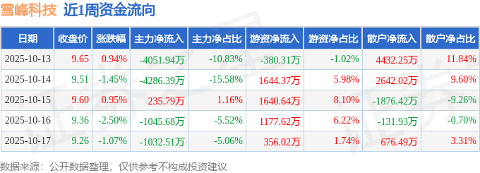 资金流向数据方面,本周雪峰科技主力资金合计净流出1.02亿元,游资资金合计净流入4438.33万元,散户资金合计净流入5742.4万元。本周资金流向一览见下表: