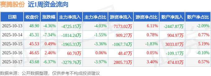 资金流向数据方面,本周赛腾股份主力资金合计净流出1.17亿元,游资资金合计净流入9868.76万元,散户资金合计净流入1855.03万元。本周资金流向一览见下表:
