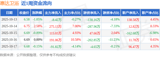 资金流向数据方面,本周惠达卫浴主力资金合计净流入480.99万元,游资资金合计净流出577.97万元,散户资金合计净流入96.97万元。本周资金流向一览见下表:
