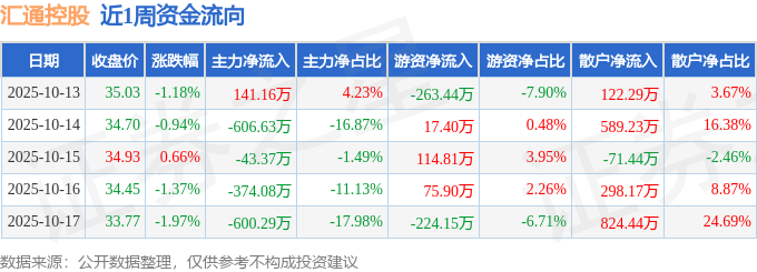 资金流向数据方面,本周汇通控股主力资金合计净流出1483.22万元,游资资金合计净流出279.49万元,散户资金合计净流入1762.7万元。本周资金流向一览见下表: