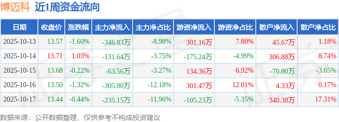 资金流向数据方面,本周博迈科主力资金合计净流出1082.99万元,游资资金合计净流入456.52万元,散户资金合计净流入626.47万元。本周资金流向一览见下表: