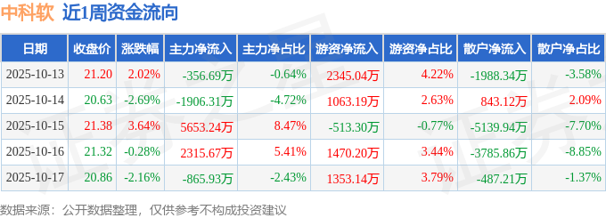 资金流向数据方面,本周中科软主力资金合计净流入4839.98万元,游资资金合计净流入5718.26万元,散户资金合计净流出1.06亿元。本周资金流向一览见下表: