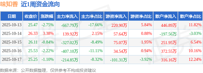 沪深股通持股方面,截止2025年10月17日收盘,味知香沪股通持股数为34.81万股,占流通股比为25.0%。
