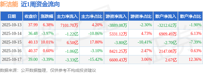 资金流向数据方面,本周新洁能主力资金合计净流入1.6亿元,游资资金合计净流出2.15亿元,散户资金合计净流入5575.07万元。本周资金流向一览见下表:
