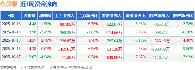 资金流向数据方面,本周永茂泰主力资金合计净流入2385.32万元,游资资金合计净流入1437.23万元,散户资金合计净流出3822.55万元。本周资金流向一览见下表: