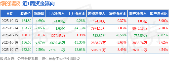 资金流向数据方面,本周绿的谐波主力资金合计净流出4.0亿元,游资资金合计净流入1.58亿元,散户资金合计净流入2.42亿元。本周资金流向一览见下表: