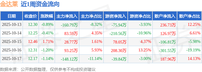 资金流向数据方面,本周金达莱主力资金合计净流出103.3万元,游资资金合计净流出40.0万元,散户资金合计净流入143.3万元。本周资金流向一览见下表: