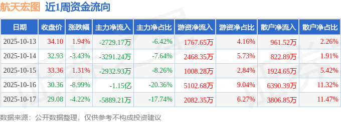 资金流向数据方面,本周航天宏图主力资金合计净流出2.63亿元,游资资金合计净流入1.24亿元,散户资金合计净流入1.39亿元。本周资金流向一览见下表: