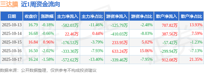 资金流向数据方面,本周三达膜主力资金合计净流出1642.02万元,游资资金合计净流出8.09万元,散户资金合计净流入1650.11万元。本周资金流向一览见下表: