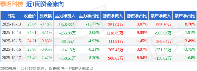 资金流向数据方面,本周泰坦科技主力资金合计净流出2754.47万元,游资资金合计净流入2855.88万元,散户资金合计净流出101.41万元。本周资金流向一览见下表: