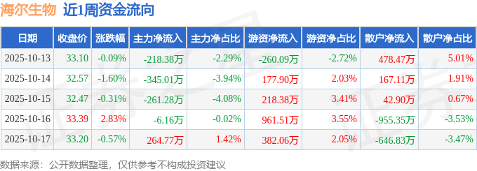 资金流向数据方面,本周海尔生物主力资金合计净流出566.06万元,游资资金合计净流入1479.75万元,散户资金合计净流出913.69万元。本周资金流向一览见下表: