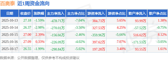 资金流向数据方面,本周百奥泰主力资金合计净流出1422.31万元,游资资金合计净流入947.2万元,散户资金合计净流入475.11万元。本周资金流向一览见下表: