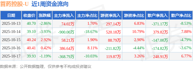 资金流向数据方面,本周首药控股主力资金合计净流出749.92万元,游资资金合计净流入814.17万元,散户资金合计净流出64.25万元。本周资金流向一览见下表: