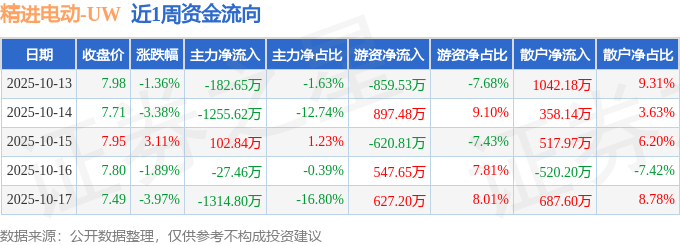 资金流向数据方面,本周精进电动主力资金合计净流出2677.69万元,游资资金合计净流入591.99万元,散户资金合计净流入2085.7万元。本周资金流向一览见下表: