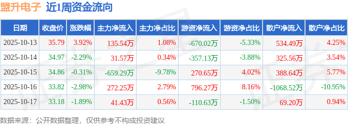 资金流向数据方面,本周盟升电子主力资金合计净流出178.5万元,游资资金合计净流出70.87万元,散户资金合计净流入249.37万元。本周资金流向一览见下表: