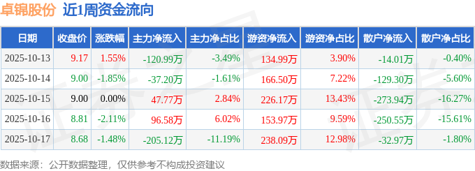 资金流向数据方面,本周卓锦股份主力资金合计净流出218.96万元,游资资金合计净流入919.73万元,散户资金合计净流出700.77万元。本周资金流向一览见下表: