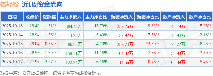 资金流向数据方面,本周倍轻松主力资金合计净流出865.61万元,游资资金合计净流入777.79万元,散户资金合计净流入87.82万元。本周资金流向一览见下表: