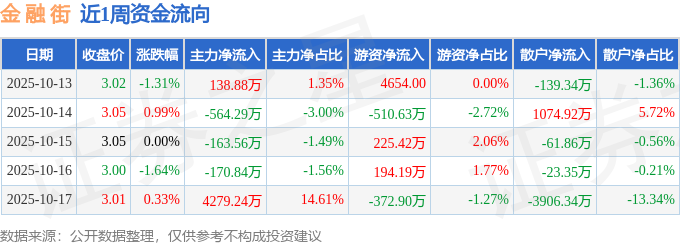 资金流向数据方面,本周金 融 街主力资金合计净流入3519.43万元,游资资金合计净流出463.46万元,散户资金合计净流出3055.97万元。本周资金流向一览见下表: