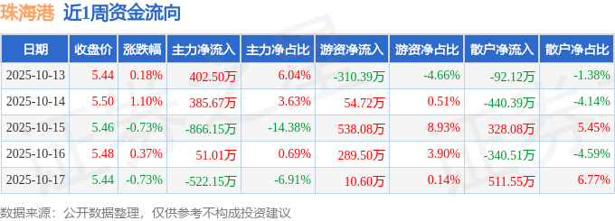 资金流向数据方面,本周珠海港主力资金合计净流出549.13万元,游资资金合计净流入582.52万元,散户资金合计净流出33.38万元。本周资金流向一览见下表: