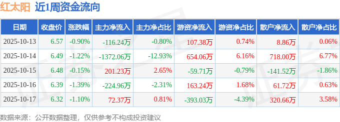 资金流向数据方面,本周红太阳主力资金合计净流出1439.66万元,游资资金合计净流入471.93万元,散户资金合计净流入967.72万元。本周资金流向一览见下表: