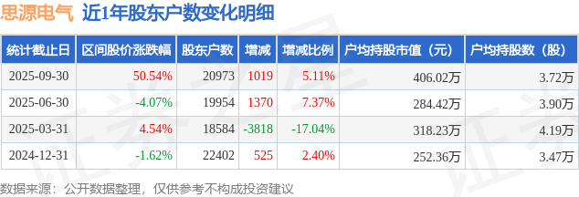 从股价来看,2025年6月30日至2025年9月30日,思源电气区间涨幅为50.54%,在此期间股东户数增加1019.0户,增幅为5.11%。