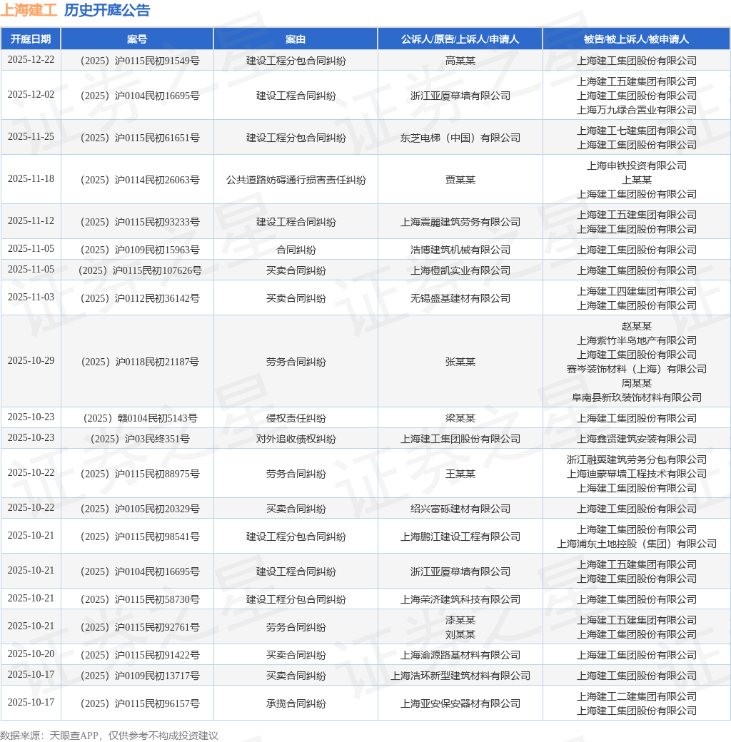 案号:(2025)沪0104民初16695号根据统计,近一年内以上海建工集团股份有限公司为当事人的历史开庭公告有404则,其中案由为“买卖合同纠纷”的公告以113则居首,其次为“建设工程施工合同纠纷”有92则,“建设工程分包合同纠纷”有44则。历史开庭公告(前20条)如下: