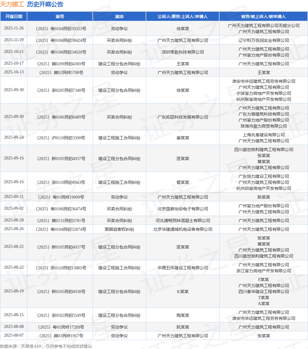 案号:(2025)粤0106民初34020号根据统计,近一年内以广州天力建筑工程有限公司为当事人的历史开庭公告有377则,其中案由为“买卖合同纠纷”的公告以130则居首,其次为“劳动争议”有61则,“票据追索权纠纷”有33则。历史开庭公告(前20条)如下: