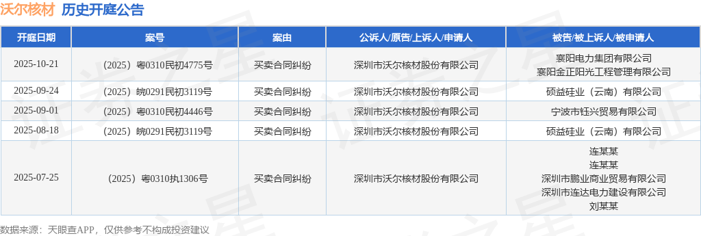 根据统计,近一年内以深圳市沃尔核材股份有限公司为当事人的历史开庭公告有5则,其中案由为“买卖合同纠纷”的公告以5则居首。历史开庭公告如下: