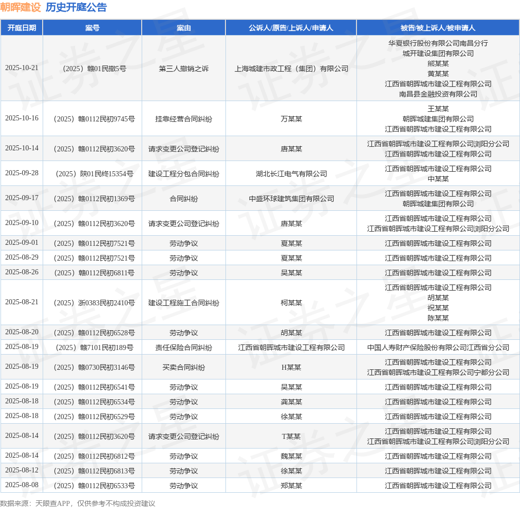 案号:(2025)赣01民撤5号根据统计,近一年内以江西省朝晖城市建设工程有限公司为当事人的历史开庭公告有116则,其中案由为“劳动争议”的公告以47则居首,其次为“建设工程施工合同纠纷”有17则,“建设工程合同纠纷”有14则。历史开庭公告(前20条)如下: