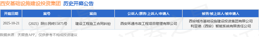 证券之星消息,根据天眼查APP显示,近日公布了一则西安城市基础设施建设投资集团有限公司作为被告/被上诉人的开庭公告,详细内容如下: