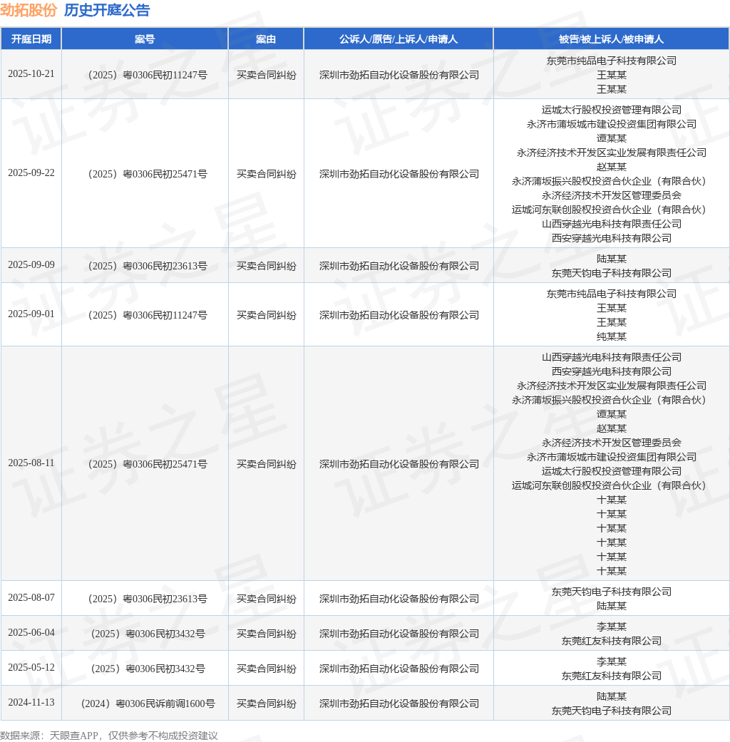 根据统计,近一年内以深圳市劲拓自动化设备股份有限公司为当事人的历史开庭公告有9则,其中案由为“买卖合同纠纷”的公告以9则居首。历史开庭公告如下: