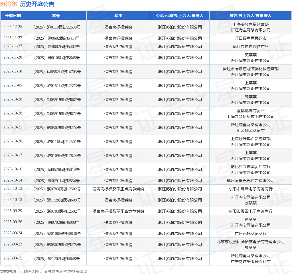 案号:(2025)赣0502知民初274号根据统计,近一年内以浙江苏泊尔股份有限公司为当事人的历史开庭公告有156则,其中案由为“侵害商标权纠纷”的公告以118则居首,其次为“商标权权属、侵权纠纷”有16则,“侵害商标权”有5则。历史开庭公告(前20条)如下: