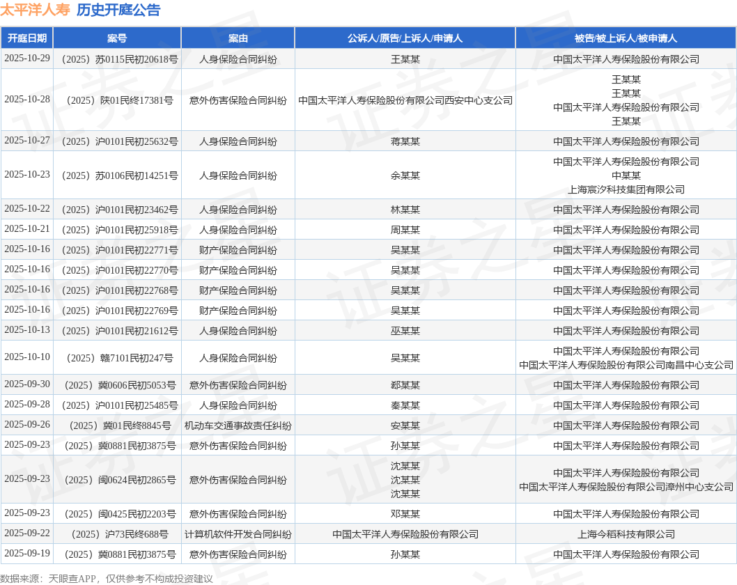 案号:(2025)沪0101民初25918号根据统计,近一年内以中国太平洋人寿保险股份有限公司为当事人的历史开庭公告有156则,其中案由为“人身保险合同纠纷”的公告以100则居首,其次为“意外伤害保险合同纠纷”有15则,“保险纠纷”有14则。历史开庭公告(前20条)如下: