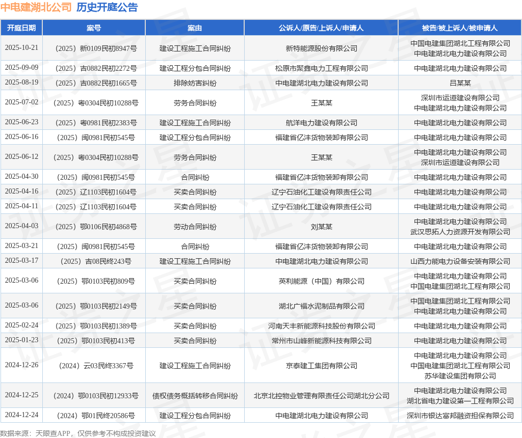 证券之星消息,根据天眼查APP显示,近日公布了一则中电建湖北电力建设有限公司作为被告/被上诉人的开庭公告,详细内容如下: