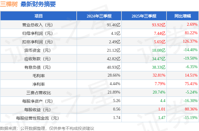 据证券之星公开数据整理,近期三棵树(603737)发布2025年三季报。截至本报告期末,公司营业总收入93.92亿元,同比上升2.69%,归母净利润7.44亿元,同比上升81.22%。按单季度数据看,第三季度营业总收入35.75亿元,同比上升5.62%,第三季度归母净利润3.08亿元,同比上升53.64%。本报告期三棵树盈利能力上升,毛利率同比增幅14.51%,净利率同比增幅75.41%。