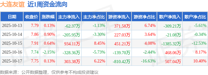 资金流向数据方面,本周大连友谊主力资金合计净流入640.82万元,游资资金合计净流入99.69万元,散户资金合计净流出740.51万元。本周资金流向一览见下表:
