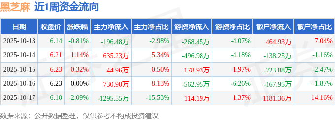 资金流向数据方面,本周黑芝麻主力资金合计净流出80.94万元,游资资金合计净流出1035.27万元,散户资金合计净流入1116.21万元。本周资金流向一览见下表: