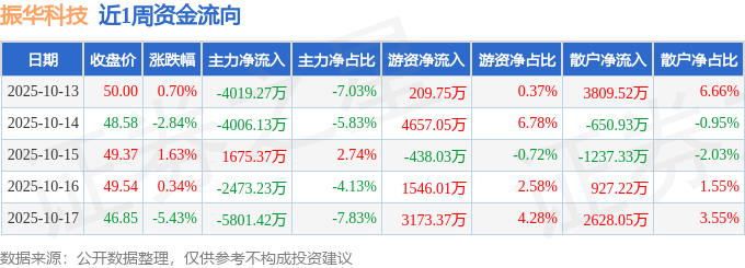资金流向数据方面,本周振华科技主力资金合计净流出1.46亿元,游资资金合计净流入9148.14万元,散户资金合计净流入5476.53万元。本周资金流向一览见下表: