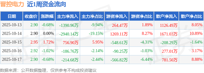 资金流向数据方面,本周晋控电力主力资金合计净流出3975.64万元,游资资金合计净流入327.9万元,散户资金合计净流入3647.73万元。本周资金流向一览见下表: