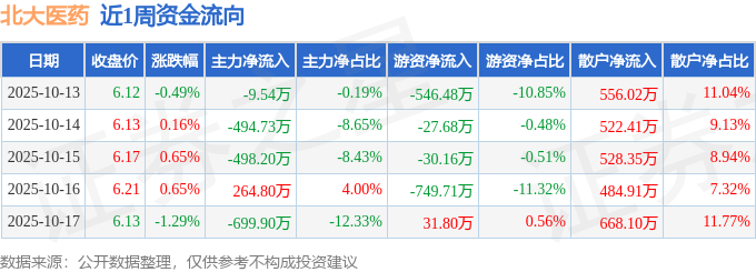 资金流向数据方面,本周北大医药主力资金合计净流出1437.57万元,游资资金合计净流出1322.21万元,散户资金合计净流入2759.79万元。本周资金流向一览见下表: