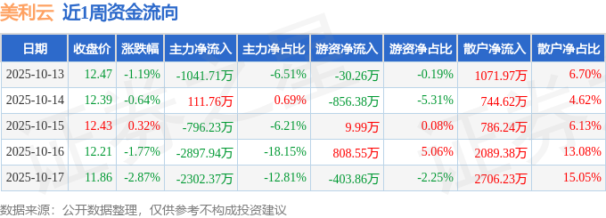 资金流向数据方面,本周美利云主力资金合计净流出6926.48万元,游资资金合计净流出471.97万元,散户资金合计净流入7398.45万元。本周资金流向一览见下表: