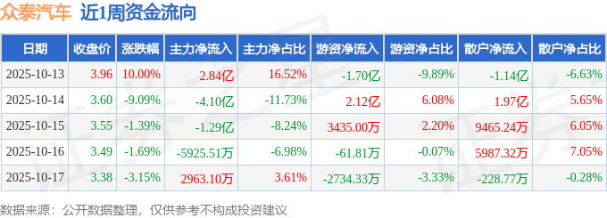 资金流向数据方面,本周众泰汽车主力资金合计净流出2.85亿元,游资资金合计净流入4904.15万元,散户资金合计净流入2.36亿元。本周资金流向一览见下表: