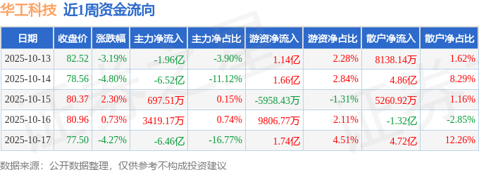 资金流向数据方面,本周华工科技主力资金合计净流出14.52亿元,游资资金合计净流入4.92亿元,散户资金合计净流入9.6亿元。本周资金流向一览见下表:
