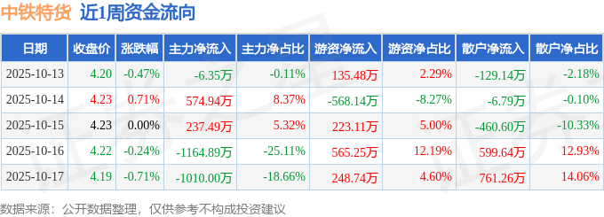 资金流向数据方面,本周中铁特货主力资金合计净流出1368.82万元,游资资金合计净流入604.45万元,散户资金合计净流入764.37万元。本周资金流向一览见下表: