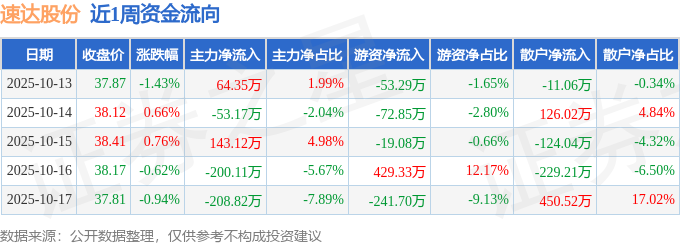 资金流向数据方面,本周速达股份主力资金合计净流出254.63万元,游资资金合计净流入42.4万元,散户资金合计净流入212.23万元。本周资金流向一览见下表: