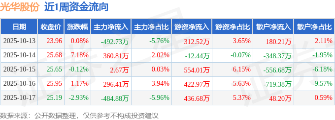 资金流向数据方面,本周光华股份主力资金合计净流出317.72万元,游资资金合计净流入1713.74万元,散户资金合计净流出1396.03万元。本周资金流向一览见下表: