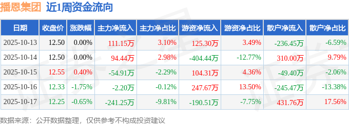 资金流向数据方面,本周播恩集团主力资金合计净流出92.77万元,游资资金合计净流出117.67万元,散户资金合计净流入210.44万元。本周资金流向一览见下表: