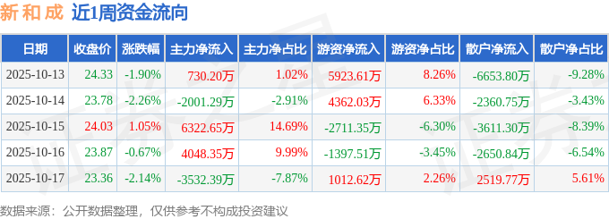 资金流向数据方面,本周新 和 成主力资金合计净流入5567.52万元,游资资金合计净流入7189.4万元,散户资金合计净流出1.28亿元。本周资金流向一览见下表: